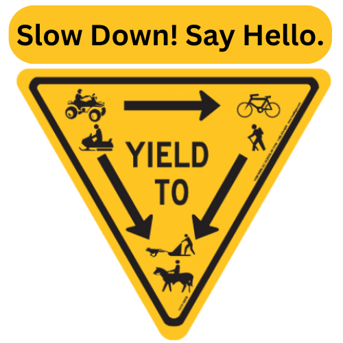 The core message of “Slow Down, Say Hello” — whether by a hi, a wave, a nod, or a smile — encourages users to reduce speed or stop to acknowledge each other for the safety of all. By encouraging users to slow down and take the time to greet each other, we hope to foster a friendlier and safer trail environment for everyone.