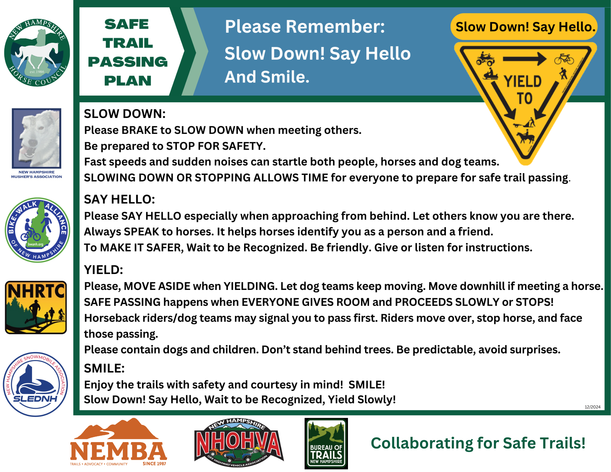 NHHC promotes trail etiquette and encourages all trail users to be respectful of each other’s presence, safety, and enjoyment. Please take a moment to review the information provided by NH State Parks.