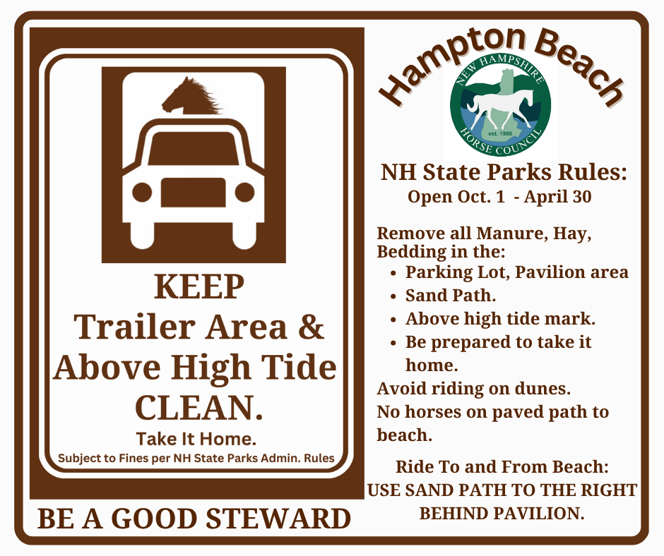 One of everyone’s favorite things to do is go riding on the beach! But if we want to ensure that equestrians are continued to allow access to New Hampshire’s limited coastline, not only do we need to be Equestrian Good Stewards ourselves, we need to ensure all users know the rules. The NHHC encourages all equestrian beach users to display the NHHC Equestrian Good Steward Beach Placard on their tow vehicle (free download below).